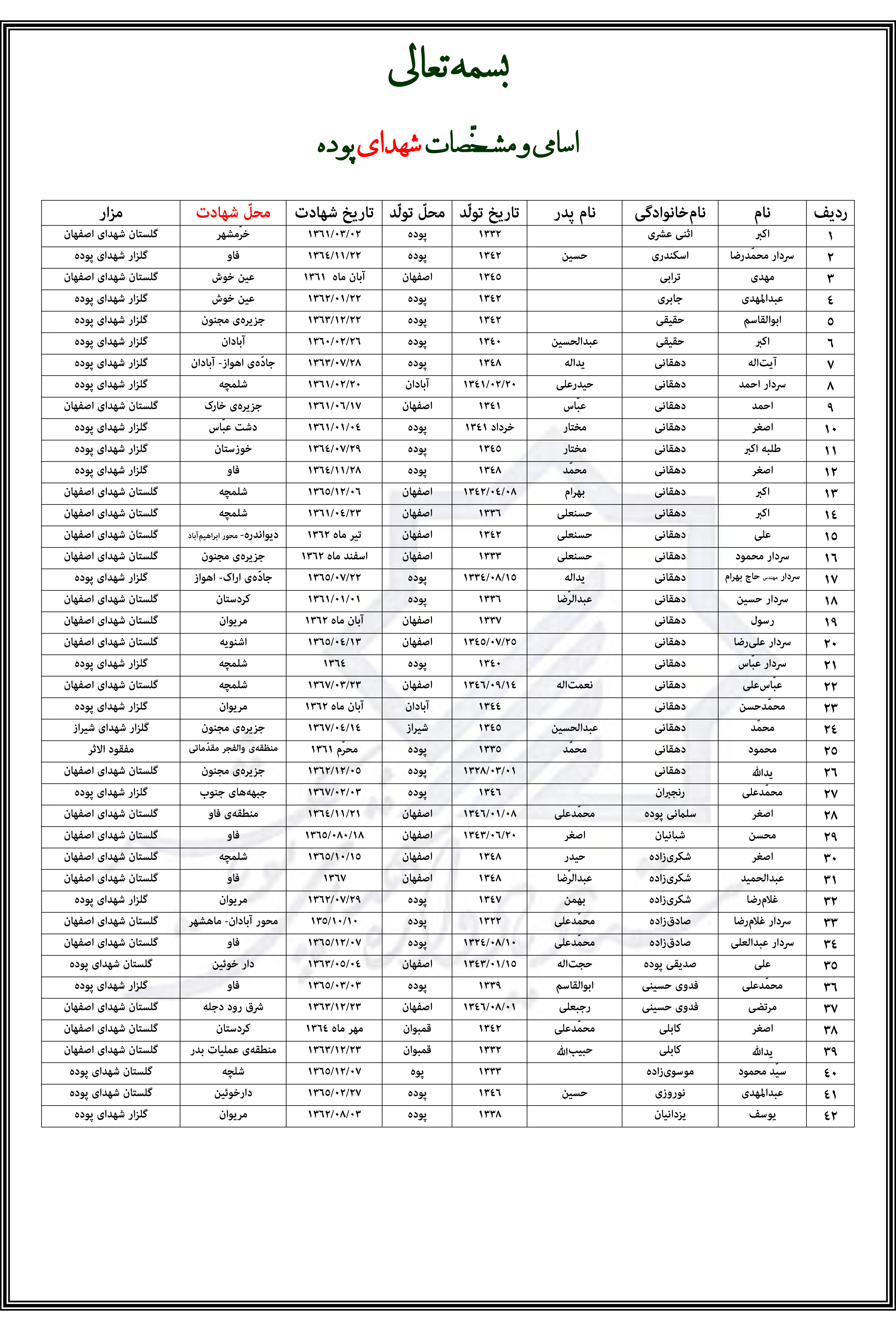 اخرین ویرایش فهرست اسامی(طبق شماره فایل عکسها) شهدای پوده